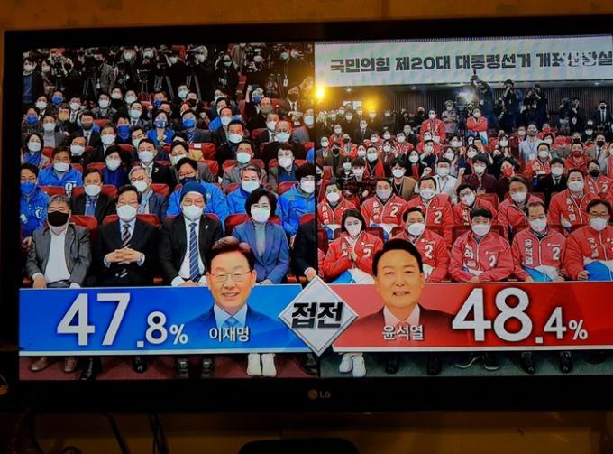 더불어민주당 이재명, 국민의힘 윤석열 대선 후보가 9일 치러진 20대 대선에서 각각 47.8%, 48.4%를 득표할 것으로 KBS·MBC·SBS 지상파 3사 출구조사에서 예측됐다.
