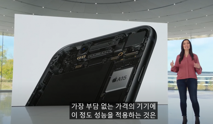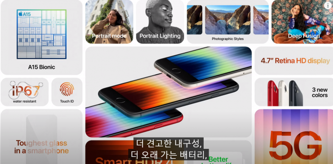 아이폰 SE 3세대인 신형 아이폰은 보급형 모델 중 처음으로 5세대(5G) 이동통신 연결을 지원하고 최신 애플리케이션프로세서(AP)인 'A15 바이오닉' 칩을 두뇌로 장착한 것이 특징. 이 칩셋은 현존하는 최고 성능 칩으로 평가받고 있다. 약 50만 원대의 보급형 제품이지만 성능은 고급형 못지 않다는 점에서 스마트폰 사용자들의 주목을 받고 있다.