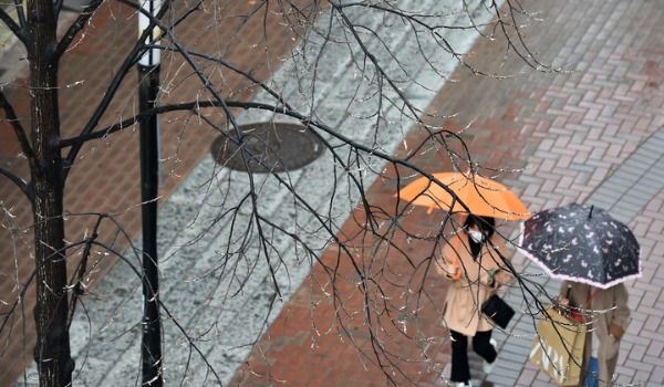 ▲ 봄비가 내리는 17일 대구 중구 동성로에서 우산을 쓴 시민들이 길을 걷고 있다. [뉴시스]