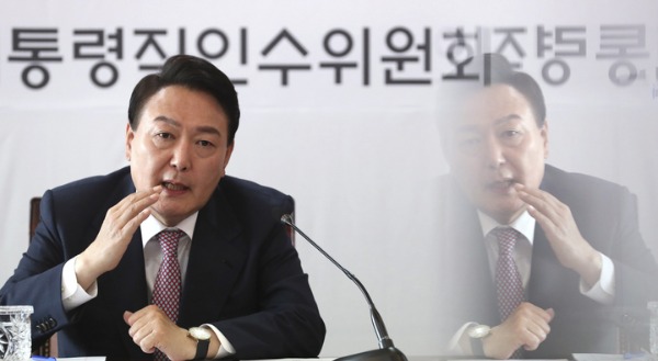 ▲ 윤석열 대통령 당선인이 지난 22일 서울 종로구 통의동에서 인수위 간사단 회의를 주재하며 발언하고 있다. [뉴시스]