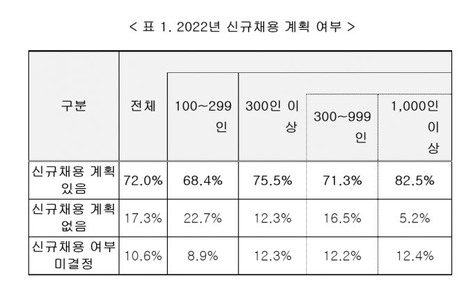 한국경영자총협회(이하 경총)가 100인 이상 기업 508개사(응답 기업 기준)를 대상으로 2022년 신규채용 실태조사를 실시한 결과 응답 기업의 72.0%가 '올해 신규채용 계획이 있다'고 답했다.