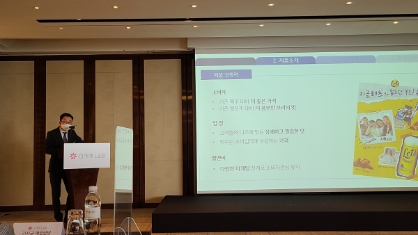 ▲ 마기환 신세계L&B 영업담당상무가 30일 서울 웨스틴조선호텔에서 발포주 '레츠 프레시 투데이'에 대해 사업방향을 발표하고 있다. [김지우 기자]