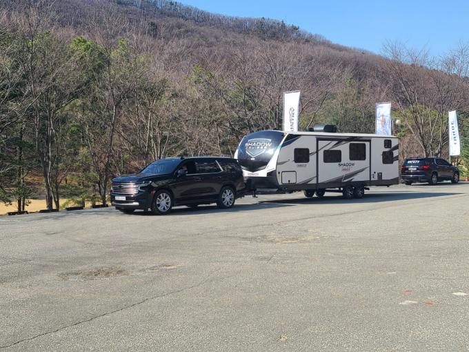 ▲ 타호가 3톤이 넘는 캠핑카를 끌고 주행하는 모습 [김혜란 기자]