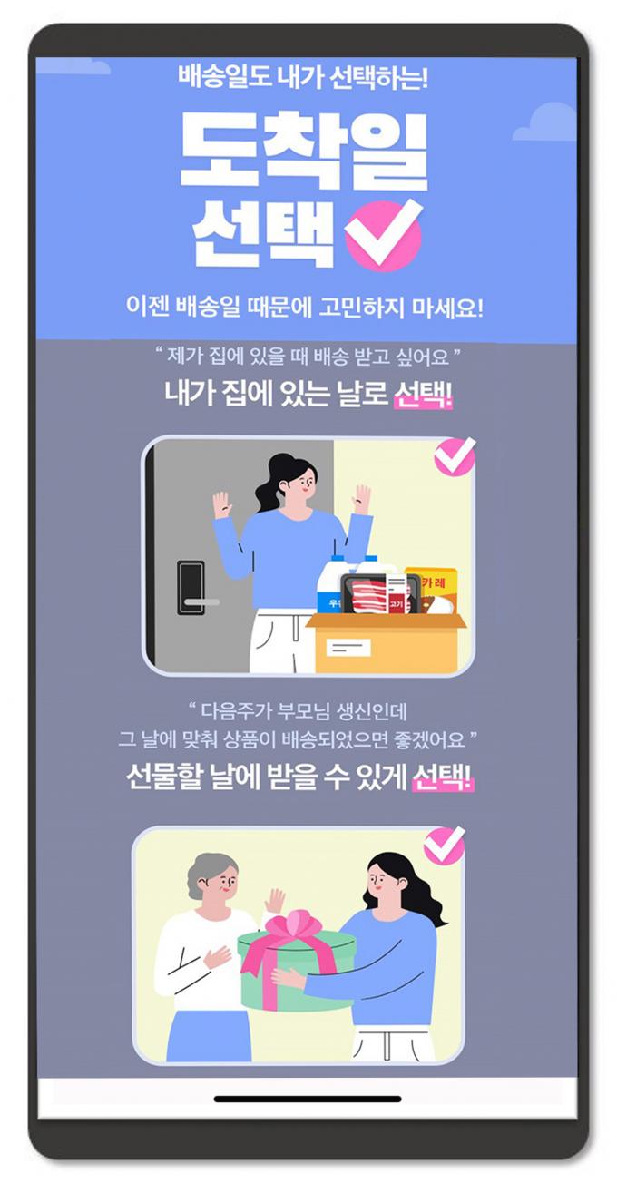 '도착일 선택' 서비스 오픈 기념 이벤트도 있다. 서비스 이용 소비자가 모바일 이벤트 페이지에 이용 '꿀팁'을 작성하면 100명을 선정해 적립금 1만 원을 주고 이달 14일까지 '도착일 선택' 서비스 이용 시 매일 500명을 추첨해 적립금 2000원도 증정한다.