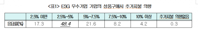 'ESG 우수 기업제품 구매 시 경쟁사 동일제품 대비 얼마나 더 지불할 의향이 있는지'에 대해서는 70%가 2.5~7.5%를 추가로 지불하겠다고 답했다.