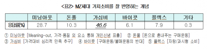 조사 결과에 따르면 MZ세대의 대표적 소비 신념은 가심비(가격대비 심리적 만족 추구)가 46.6%로 가장 높았고 미닝아웃(Meaning-out, 가격·품질 외의 요소로 개인 신념을 표출) 28.7%, 돈쭐(돈으로 혼내주는 구매운동) 10.3%, 플렉스(자랑이나 과시형 소비) 7.9% 순이었다.
