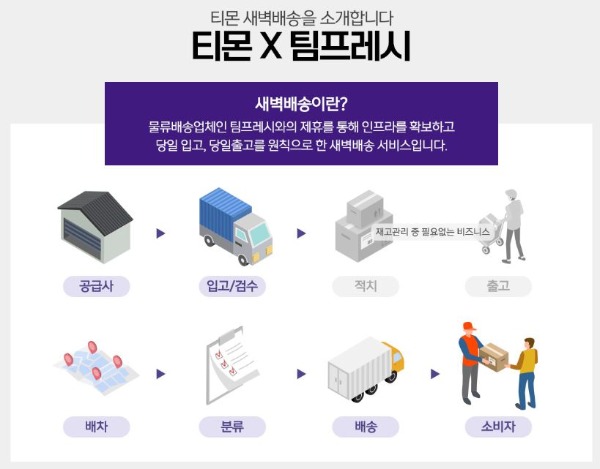 마켓컬리와 쿠팡, SSG닷컴 등이 주도해 온 새벽 배송 시장에 티몬도 뛰어들었다. 티몬은 자체 물류센터를 세우는 대신 콜드체인 물류기업와 손잡고 새벽배송을 진행하는 방안을 택했다.