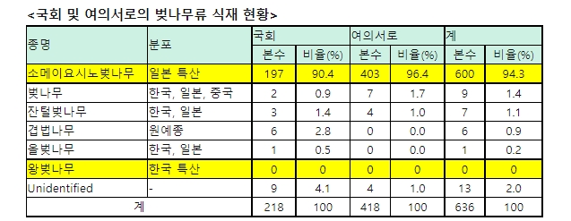 조사 결과에 따르면 국회와 여의서로에 식재되어 있는 벚나무는 거의 모두 일본 원산의 소메이요시노 벚나무로 밝혀졌다. 국회에 식재된 벚나무류 218본 중 197본(90.4%), 여의서로는 418본 중 403본(96.4%)이 소메이요시노 벚나무였다. 우리나라 토종 왕벚나무는 한 그루도 발견되지 않았다.