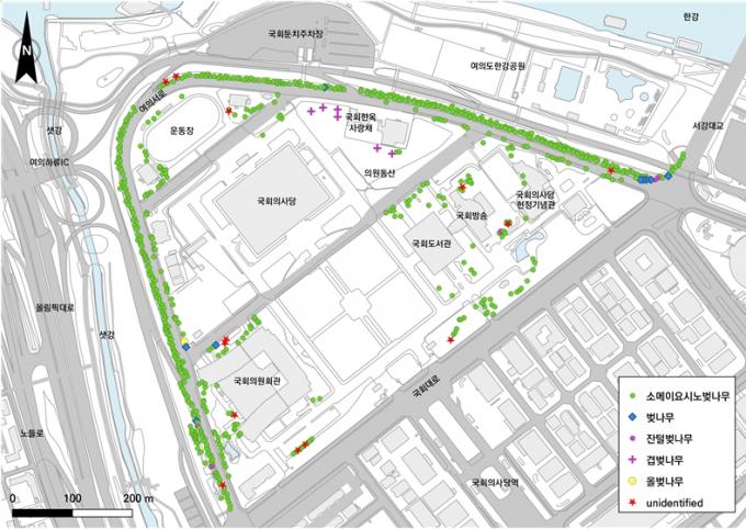 ▲국회 및 여의서로의 벚나무류 식재 현황 [왕벚프로젝트2050 제공]