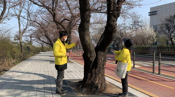 ▲지난 4일 국회 안팎서 벚나무 종류를 조사하는 왕벚프로젝트2050 회원들. [왕벚프로젝트2050 제공]