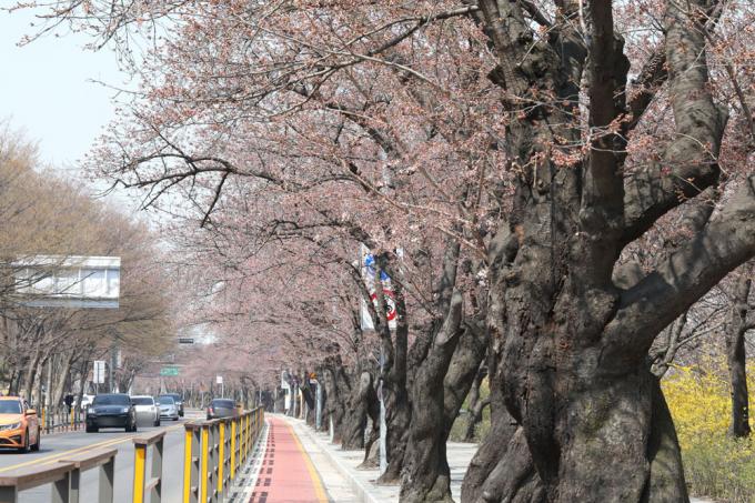 ▲지난 4일 꽃망울이 곧 터질 듯한 여의서로의 벚나무. 거의 모두 일본산 소메이요시노 벚나무다. [왕벚프로젝트2050 제공]