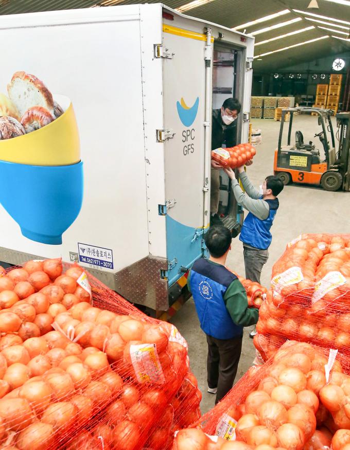 ▲5일 전라남도 무안군 전남서남부채소농협에서 SPC그룹 직원들이 어려움을 겪는 무안 양파 농가를 돕기 위해 양파를 수매해 옮기고 있다. [SPC그룹 제공]