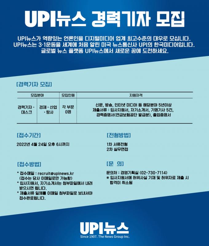 UPI뉴스가 역량 있는 언론인을 디지털미디어 업계 최고 수준의 대우로 모십니다. UPI뉴스는 3·1 운동을 세계에 처음 알린 미국 뉴스통신사 UPI의 한국미디어입니다. 글로벌 뉴스 플랫폼 UPI뉴스에서 새로운 꿈에 도전하세요.