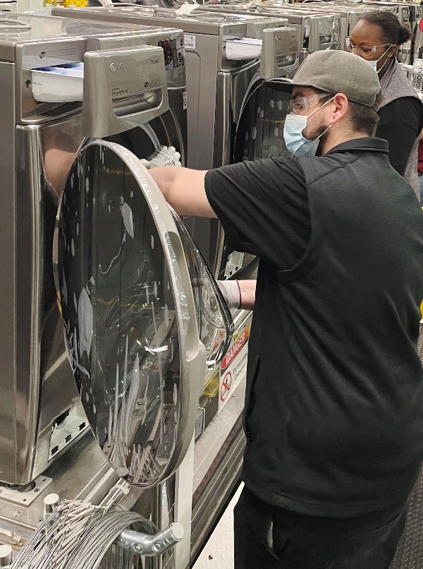 ▲ LG전자 직원이 미국 테네시(Tennessee)주 클락스빅(Clarksville)에 있는 세탁기 라인에서 드럼 세탁기 생산에 분주하다. [LG전자 제공]