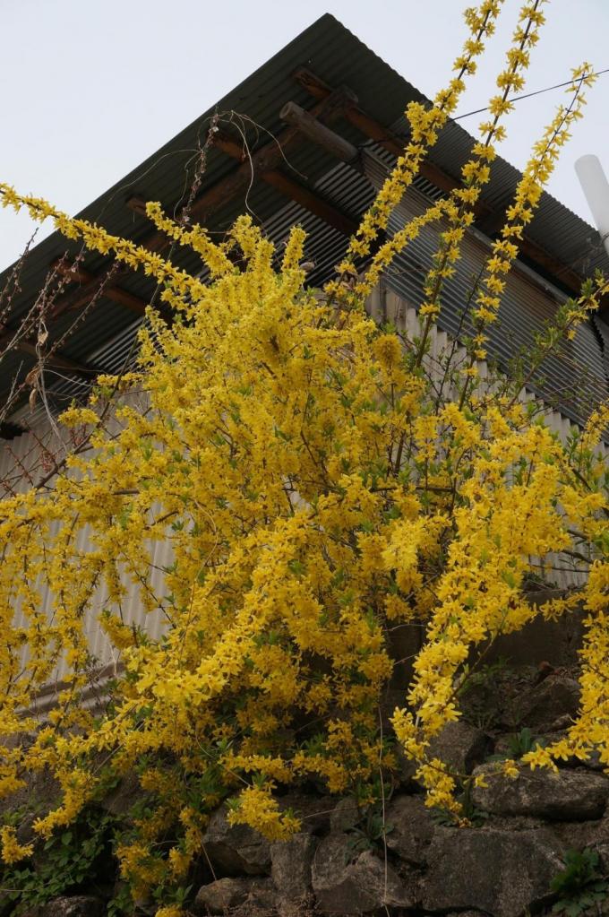 ▲산꽃술레길 끝자락에 있는 마을 돌담에 흐트러지게 핀 개나리.[upi뉴스 충청본부]