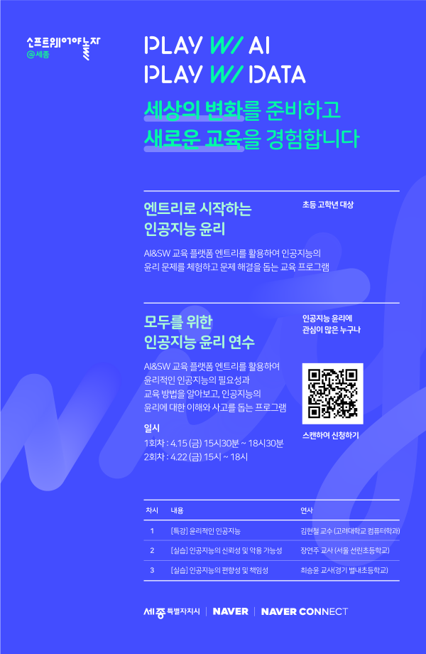 올해에는 AI 윤리 문제, 프로그램에 추가 네이버 커넥트재단이 세종시와 함께 기획한 '소프트웨어야 놀자@세종' 프로그램을 지난해에 이어 올해에도 진행한다.