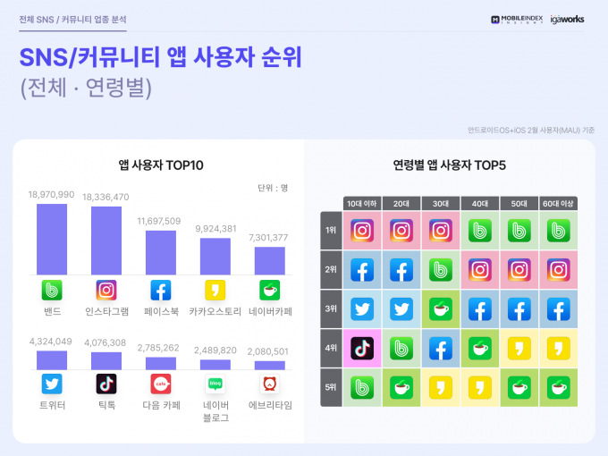 밴드, 10대 5위→20대 4위→30대 2위→40대 이상 1위 '네이버 밴드'가 SNS(사회관계망서비스) 중 한국에서 사용자가 가장 많은 앱으로 나타났다. 중장년 사용자가 많은 덕이다. 30대 이하 연령대에서는 '인스타그램'의 인기가 높았다.