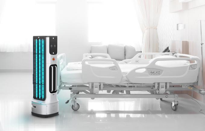 'LG 클로이 UV-C봇'은 비대면 방역용 로봇으로 시간 제약 없이 24시간 수시로 방역할 수 있다. LG 클로이 방역로봇엔 자율 주행 및 장애물 회피 기술 등 다양한 기술이 담겼다. 앱을 통해 살균 진행 상태, 작업 구역 등을 확인해 동작도 제어할 수 있다.