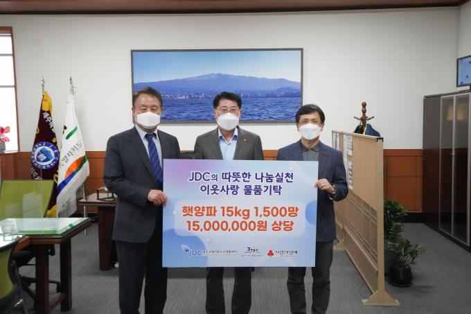 안동우 제주시장은 "전년 대비 햇양파 재배면적 증가와 가격 폭락으로 산지 폐기까지 하는 실정"이라며 "어려움을 겪고 있는 농가를 위해 JDC가 함께해 주셔서 감사한 마음을 전한다"고 밝혔다.