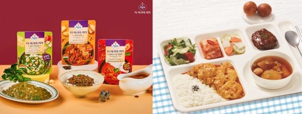 ▲ 샘표의 티아시아 커리 '키마' '빈달루' '팔락 파니르'(왼쪽)과 CJ프레시웨이의 생어거스틴 '꿍 팟 봉커리'가 급식판에 담긴 모습. [샘표·CJ프레시웨이 제공]