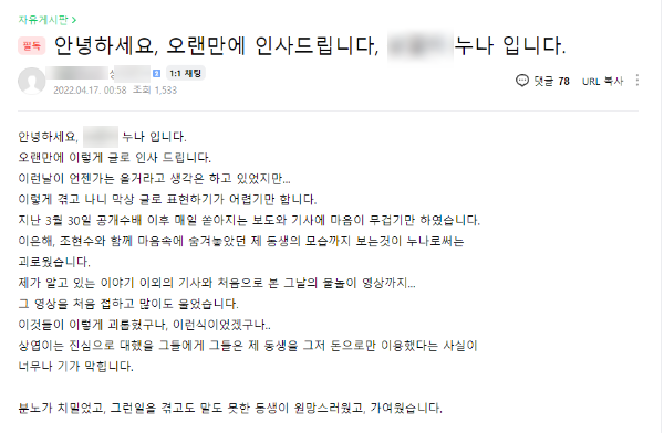 이어 "그들은 제 동생을 그저 돈으로만 이용했다는 사실이 기가 막히다"며 "제 동생을 담보로 본인의 경제적 이득을 취하려고 했던 그 짐승들을 도저히 용서할 수 없다"고 했다.