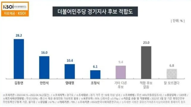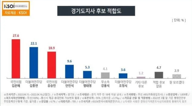 이번 조사는 TBS 의뢰로 지난 15, 16일 경기도에 거주하는 만 18세 이상 남녀 1009명을 대상으로 실시됐다. 100%로 ARS 방식으로 실시됐고 응답률은 6.7%다. 표본오차는 95% 신뢰수준에서 ±3.1%p. 자세한 사항은 중앙선거여론조사심의위 홈페이지 참조.