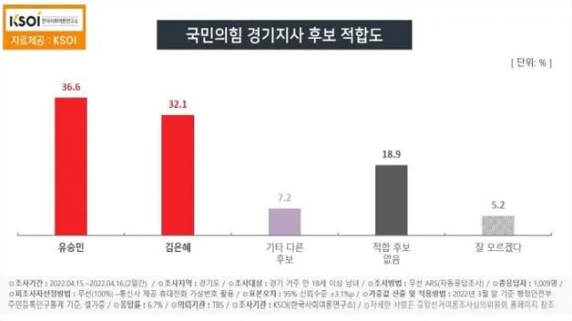 국민의힘 적합도 劉 36.6% 金 32.1%…金, 당심 과반 차기 경기지사 적합도에서 국민의힘 김은혜 의원과 새로운물결 김동연 대표가 오차범위 내에서 접전을 벌이는 것으로 나타났다.