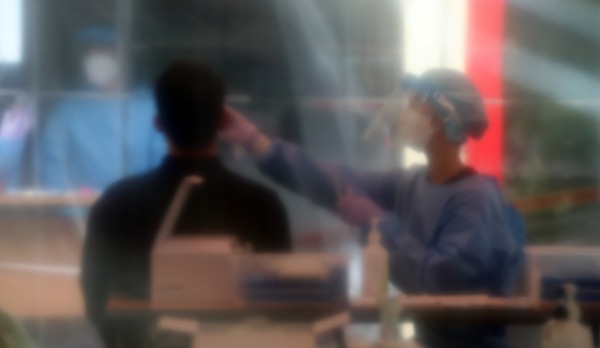 ▲ 18일 연제구 보건소 선별진료소를 찾은 한 시민이 PCR검사를 위한 검체를 채취하고 있다. [뉴시스]