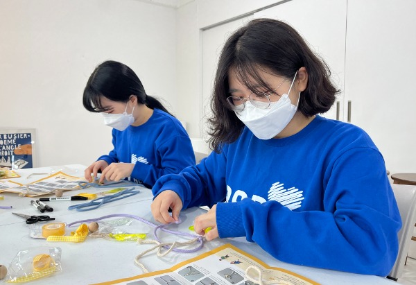 ▲ bhc치킨 해바라기 봉사단 6기 2조 활동자가 인형 키링을 만들고 있다. [bhc치킨 제공]