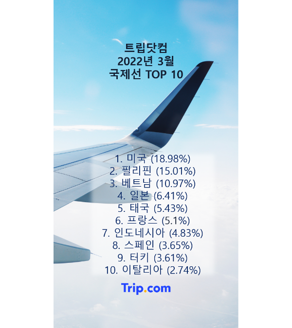 이용자들이 가장 많이 주문한 국제 항공권은 △미국(18.9%) △필리핀(15%) △베트남(10.9%) △일본(6.4%) △태국(5.4%) △프랑스(5.1%) △인도네시아(4.8%) △스페인(3.6%) △터키(3.6%) △이탈리아(2.7%) 순이었다. 미주 및 유럽 노선이 상위권을 차지했다.