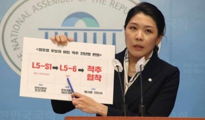 신 의원에 따르면 척추질환으로 병역 4급 판정을 받은 정 후보자 아들의 진단명은 세 번 바뀌었다. 2013년 처음 받은 진단은 'L5-S1 DISC EXTRUSION'으로 요추 5번과 천추 1번 사이의 디스크 돌출이었다.