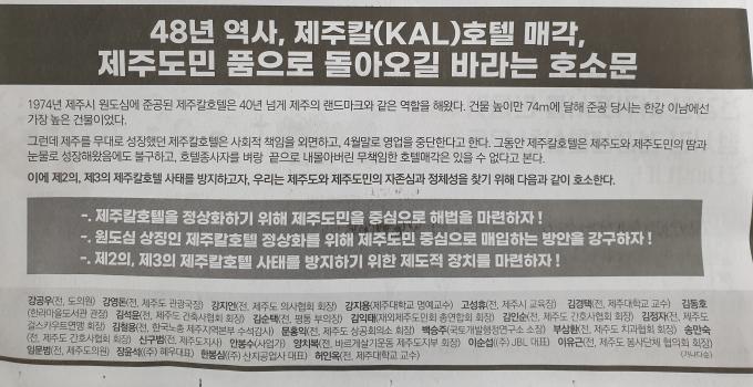 신구범 전 제주도지사와 전 제주대교수 등 26명 이름이 적힌 이 광고는 "제주 칼호텔은 제주도와 제주도민의 땀과 눈물로 성장해왔음에도 불구하고, 호텔종사자를 벼랑 끝으로 내몰아 버린 무책임한 호텔매각은 있을 수 없다고 본다"며 '제주도민 중심으로 매입하는 방안 강구' 등의 요구를 하고 있다.