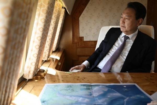 ▲ 윤석열 대통령 당선인이 지난 20일 호남으로 향하는 공군2호기에서 새만금 일대를 내려다보며 현황 보고를 받고 있다. [윤석열 당선인 대변인실 제공]