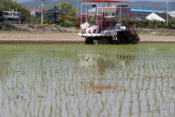 ▲ 한 농민이 지난 19일 부산 강서구에 있는 논에서 모내기를 하고 있다. [뉴시스]