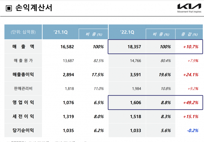 기아는 25일 서울 양재동 기아 본사에서 기업설명회(IR)를 열고 IFRS 연결기준 2022년 1분기 매출액이 18조3572억 원, 영업이익은 1조6065억 원을 기록했다고 밝혔다. 전년 동기보다 각각 10.7%, 49.2% 성장한 결과다.