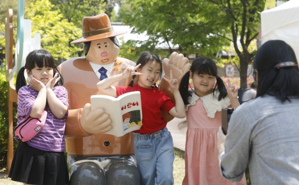 ▲ 어린이날을 하루 앞둔 4일 서울 국립민속박물관 어린이박물관을 찾은 어린이들이 방정환 선생 모형과 함께 기념촬영하고 있다. [뉴시스]