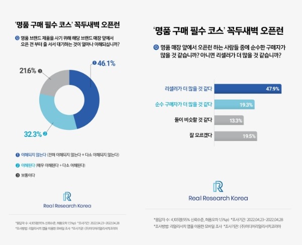 리서치 전문 기업 미디어리얼리서치코리아가 지난달 23일부터 28일까지 자사 애플리케이션을 통해 성인남녀 패널 4105명을 대상으로 '명품 매장 앞 지속되는 오픈런에 대한 인식 관련 설문조사'를 실시했다. 95% 신뢰수준에서 허용오차는 1.5%포인트다.