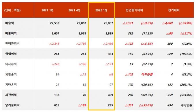 매출은 전년 동기(2조7538억 원)에 비해 9.2% 감소했으나, 영업이익은 전년 동기(264억 원) 대비 63.9% 상승한 수치다. 당기순이익은 지난해 1분기 실적에 중국 광산기업 매각 자금 회수액이 반영돼 전년 동기 대비 55.0% 감소했다.