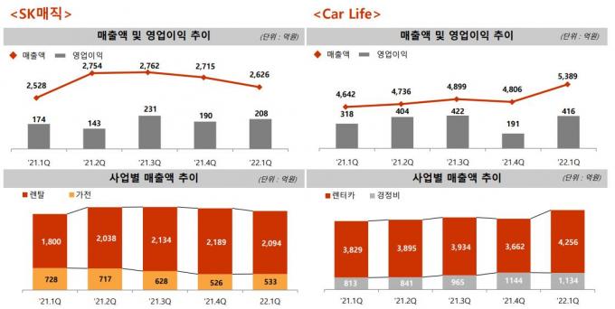 SK렌터카는 4256억 원의 매출을 기록해 전년 동기 대비 427억 원 증가했다. 회사는 "중고차 매각이익 증가 및 제주 중심의 국내여행 수요 증가가 효과를 거뒀고, 'SK렌터카 타고페이'와 온라인 전용 '중고차 장기렌터카' 등 신규 상품도 긍적적 요인이 됐다"고 말했다. 이러한 요인으로 SK렌터카와 스피드메이트 등이 포함된 '카 라이프' 부문의 영업이익(416억 원)은 전년 동기 대비(98억 원↑), 지난해 4분기 대비(225억 원↑) 증가했다.