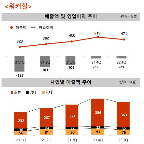 워커힐은 코로나19 거리두기 완화로 객실 및 식음료 사업이 활성화됨에 따라 손실 폭을 대폭 줄였다. 영업이익(-21억 원) 적자폭이 전년 동기(-127억 원) 대비 크게 줄었고(106억 원↓), 매출(471억 원)은 전년 동기(323억 원) 대비 148억 원 늘었다.