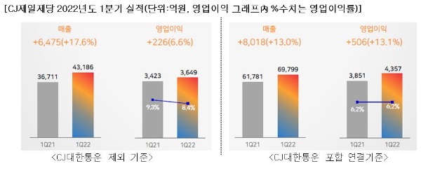 한편, CJ대한통운을 포함한 올 1분기 연결기준 CJ제일제당의 매출은 전년 동기 대비 13% 성장한 6조9799억 원에 달한다. 영업이익은 같은 기간 13.1% 늘어난 4357억 원을 달성했다.