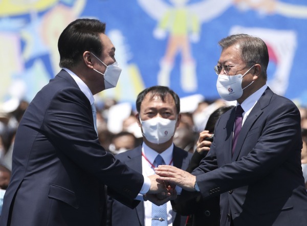 윤 대통령 내외는 11시쯤 '국민희망대표' 20명과 함께 연단에 올랐다. 윤 대통령이 단상에 올라 가장 먼저 찾은 이는 문재인 전 대통령이었다. 지난 3월 28일 청와대 만찬 회동 후 40여일 만에 전·현직 대통령이 다시 만난 것이다. 문 전 대통령은 밝은 표정으로 윤 대통령에게 먼저 손을 내밀었다.