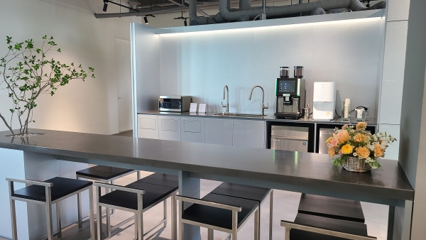 ▲ 무신사 스튜디오 성수 내 커피머신이 마련된 오픈라운지. [김지우 기자]