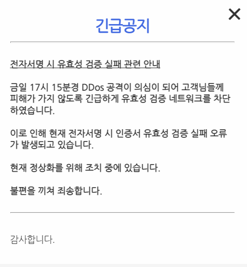 한국전자인증은 이날 오후 5시 15분쯤 디도스로 의심되는 공격을 받아 유효성 검증 네트워크를 차단했다.