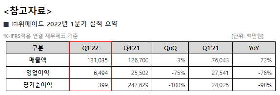 위메이드의 1분기 매출은 1310억 원으로 전년 동기 대비 72% 상승했다. 반면 영업이익은 65억 원으로 전년보다 76% 줄었다. 당기순이익도 전년 같은 기간보다 무려 98% 감소한 4억 원에 불과했다.