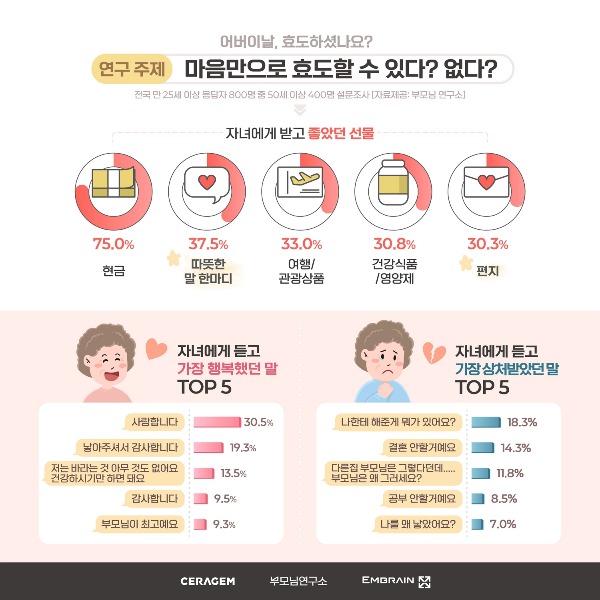 세라젬 부모님 연구소는 최근 50대 이상 부모 400명을 대상으로 자녀로부터 받고 좋았던 선물에 대해 조사한 결과 두 번째로 많은 37.5%가 '따뜻한 말 한마디'를 꼽았다고 11일 밝혔다.