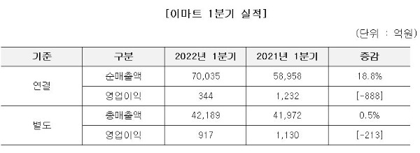 이마트는 올해 1분기 연결기준 순매출액이 전년 동기 대비 18.8% 신장한 7조35억 원을 기록했다고 12일 공시했다.