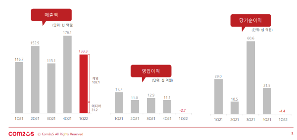 사업 확대·인력 확충 등이 적자 원인 컴투스가 올해 1분기 영업손실 27억원, 순손실 44억 원을 기록하며 적자 전환했다. 매출은 1333억 원으로 전년 동기보다 14.3% 증가했다.