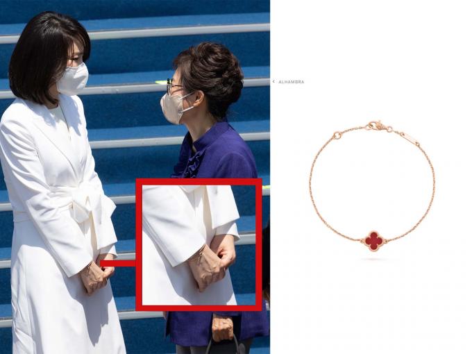 그런데 미담 전하기 바쁜 이들이 모르는 게 있다. 모르는척 하는 것일 수도 있겠다. 그날 김 여사 손목의 팔찌인데, 사진을 확대해보면 붉은 네잎 클로버 문양이 선명하다. 프랑스 명품 '반 클리프 앤 아펠'의 상징적 문양이다. 네이버에서 찾아보니 판매정가가 200만 원대다.