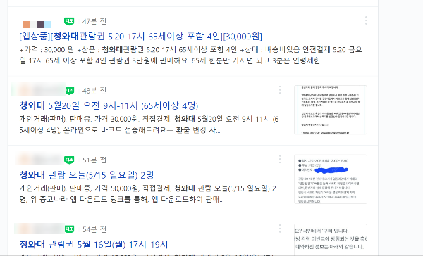 이에 웃돈을 주고라도 무료 관람권을 사려는 사람들도 늘고 있다. 이날 한 중고 거래 사이트 검색창에 '청와대 관람권'을 검색하면 200건이 넘는 게시글이 올라와 있다. 가격은 1인 기준 1만 원에서 2만 원에 이른다.